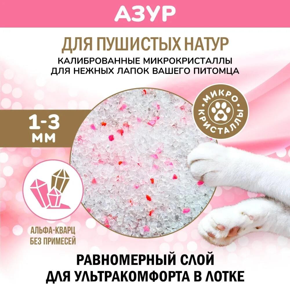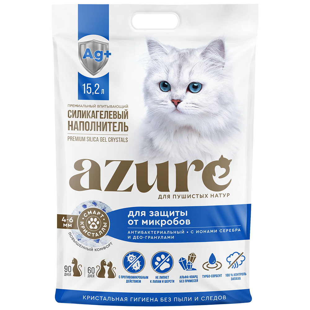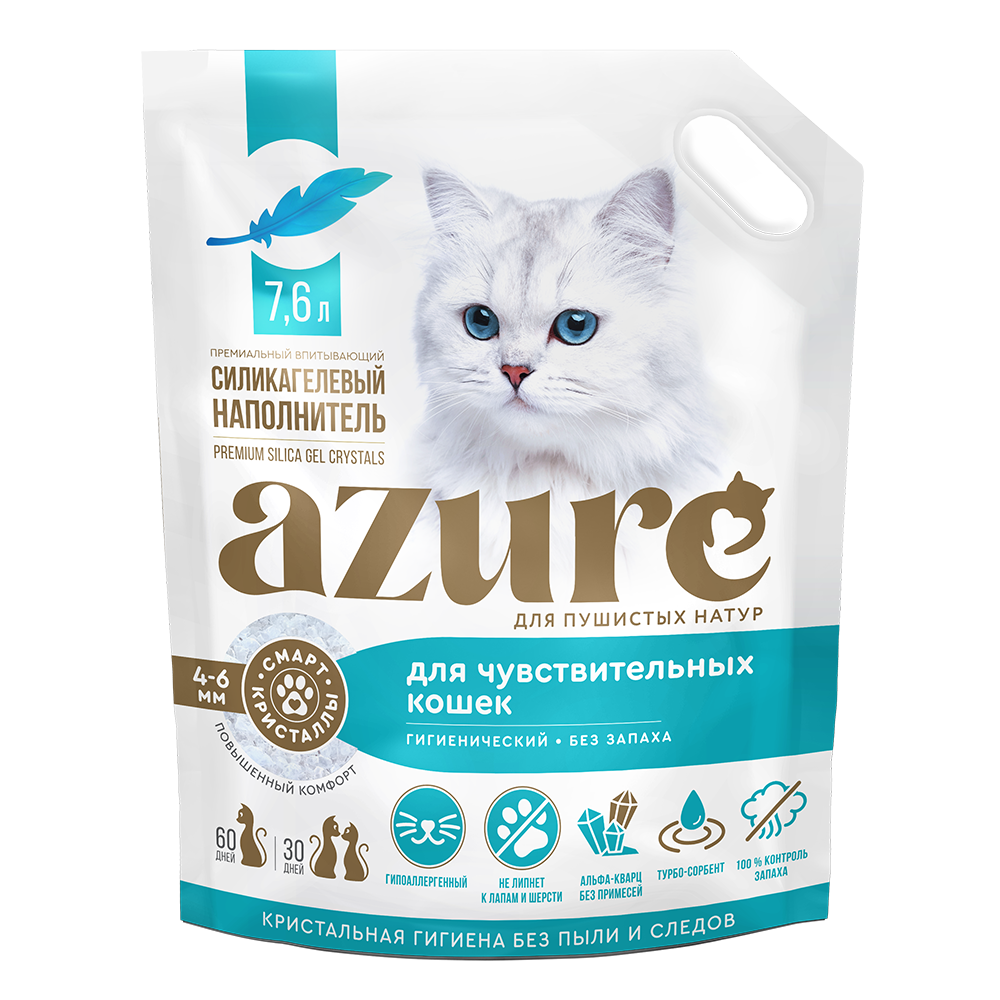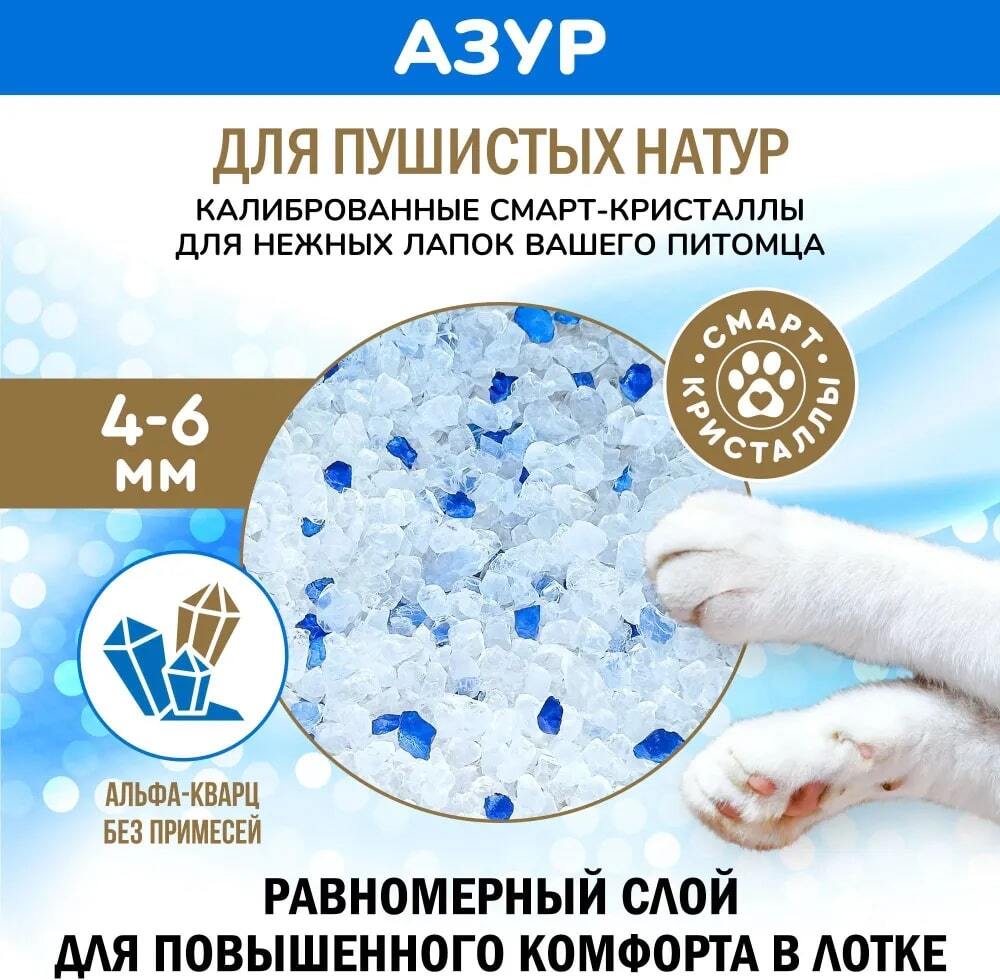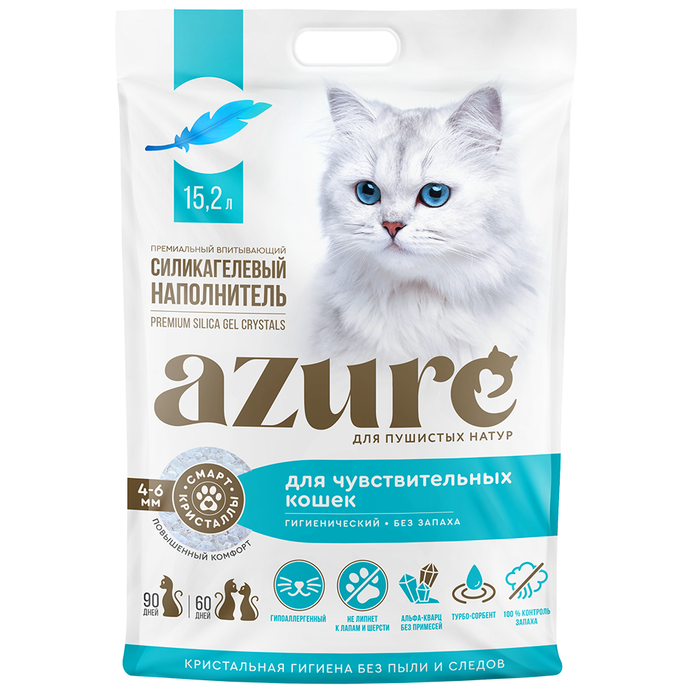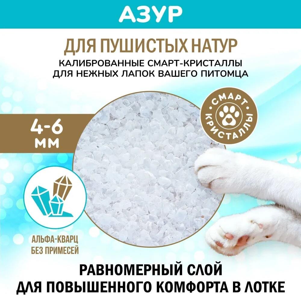 Гигиенический наполнитель Azure, смарт-кристаллы 4-6 мм, без запаха бережен к лапкам и удобен для туалета чувствительных котов, а так же не создает дискомфорта, благодаря отсутствию ароматов и красителей в составе.