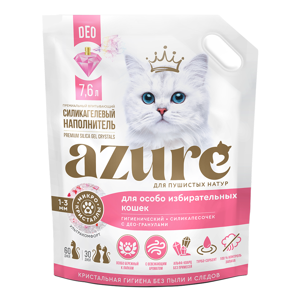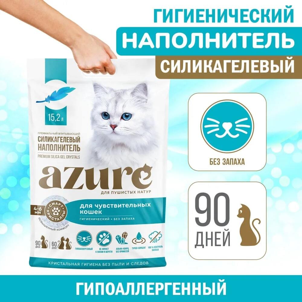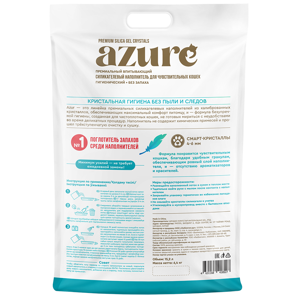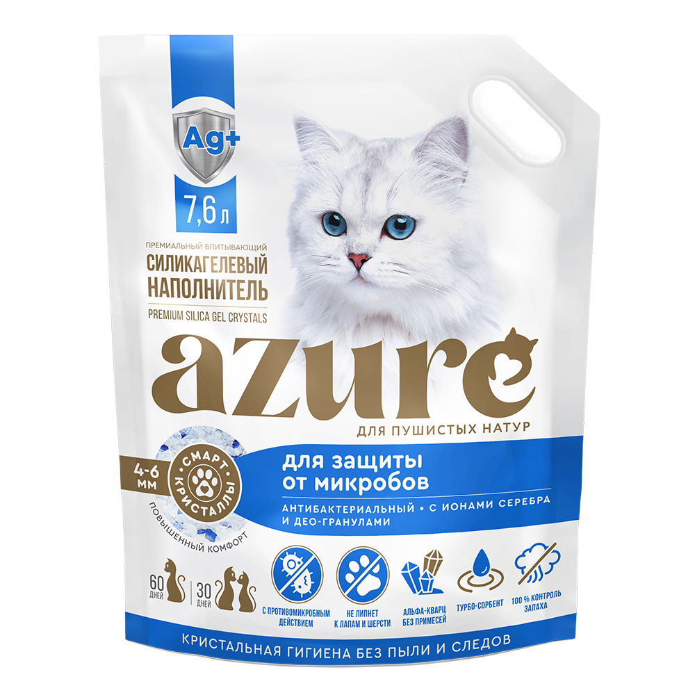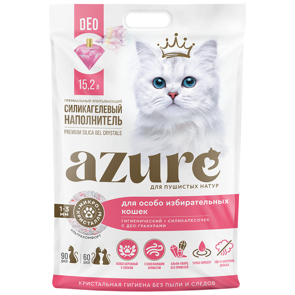 Гигиенический наполнитель Azure, смарт-кристаллы 4-6 мм, без запаха бережен к лапкам и удобен для туалета чувствительных котов, а так же не создает дискомфорта, благодаря отсутствию ароматов и красителей в составе.