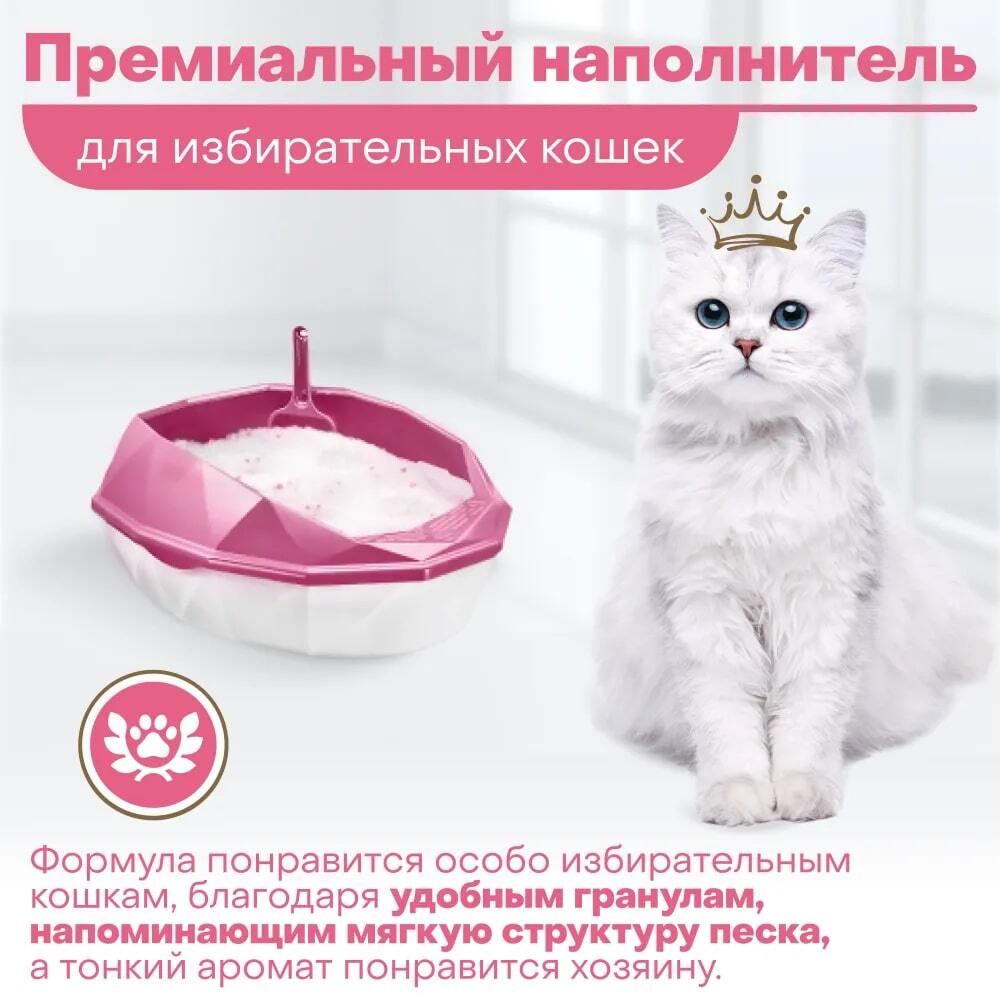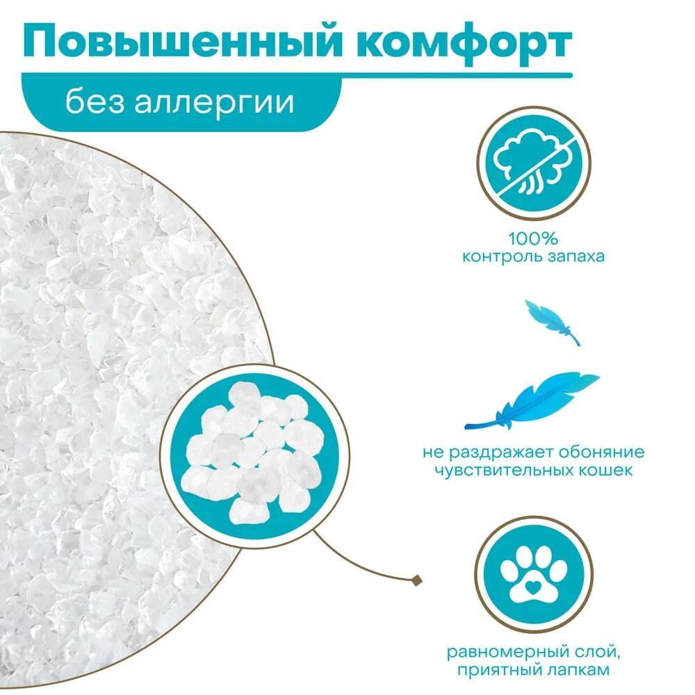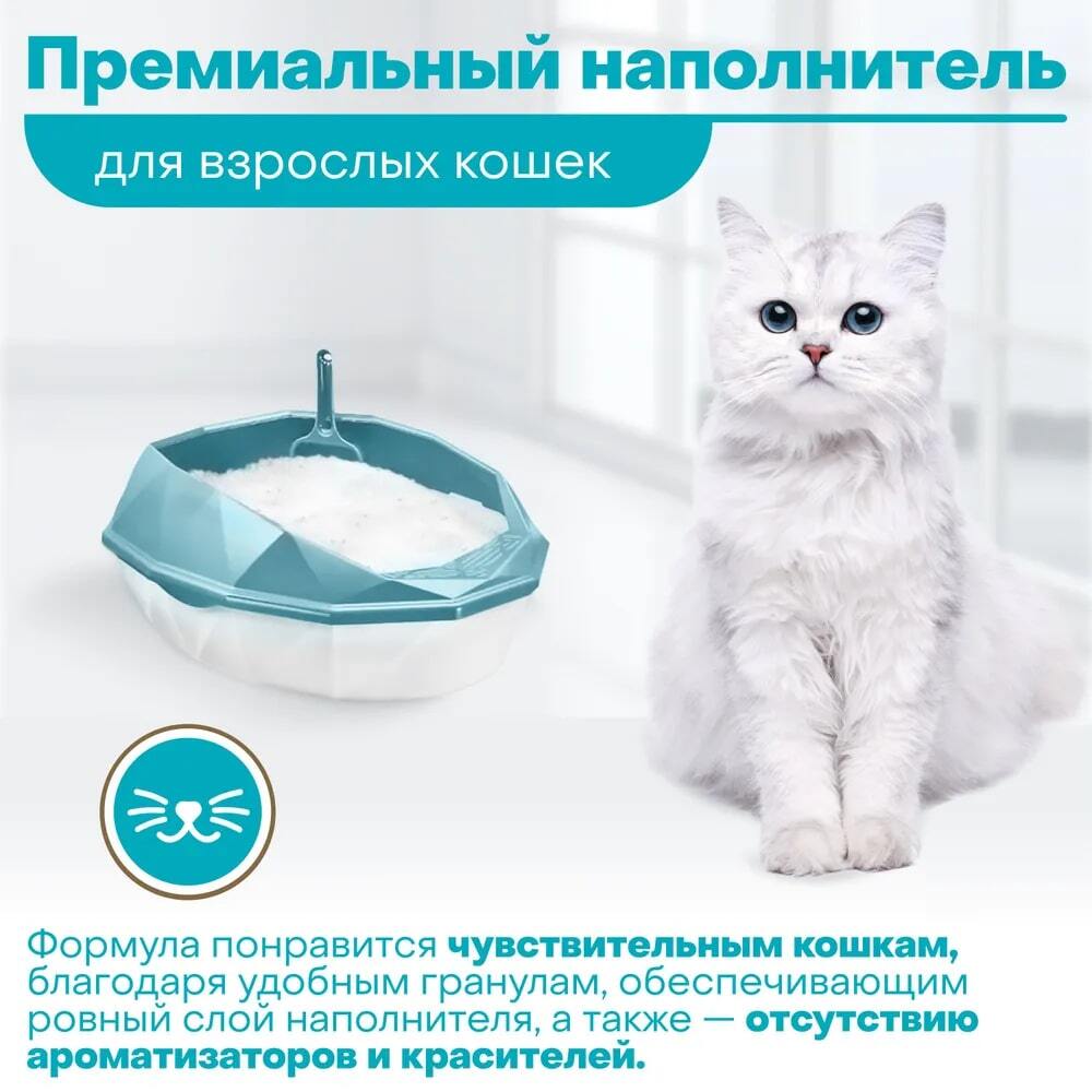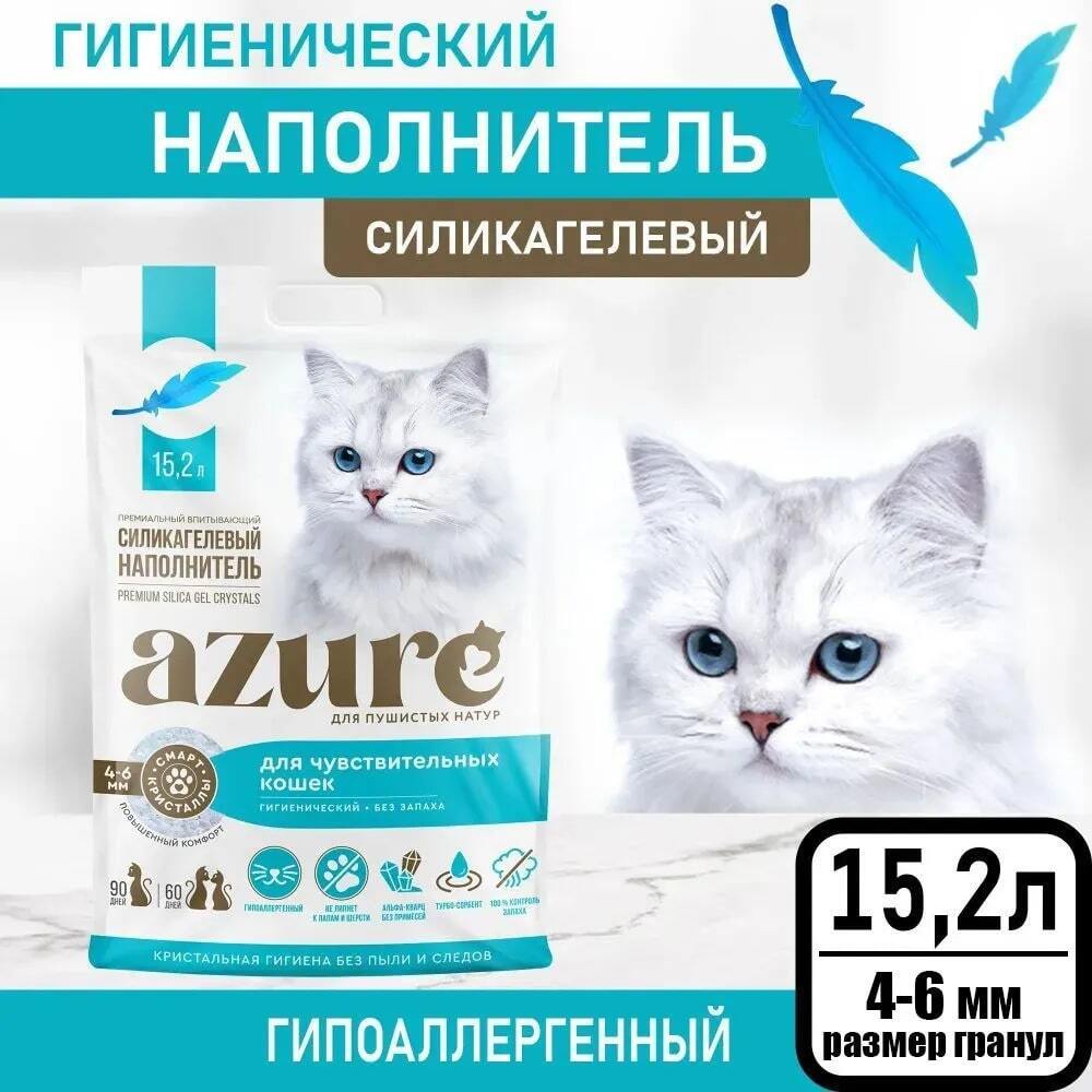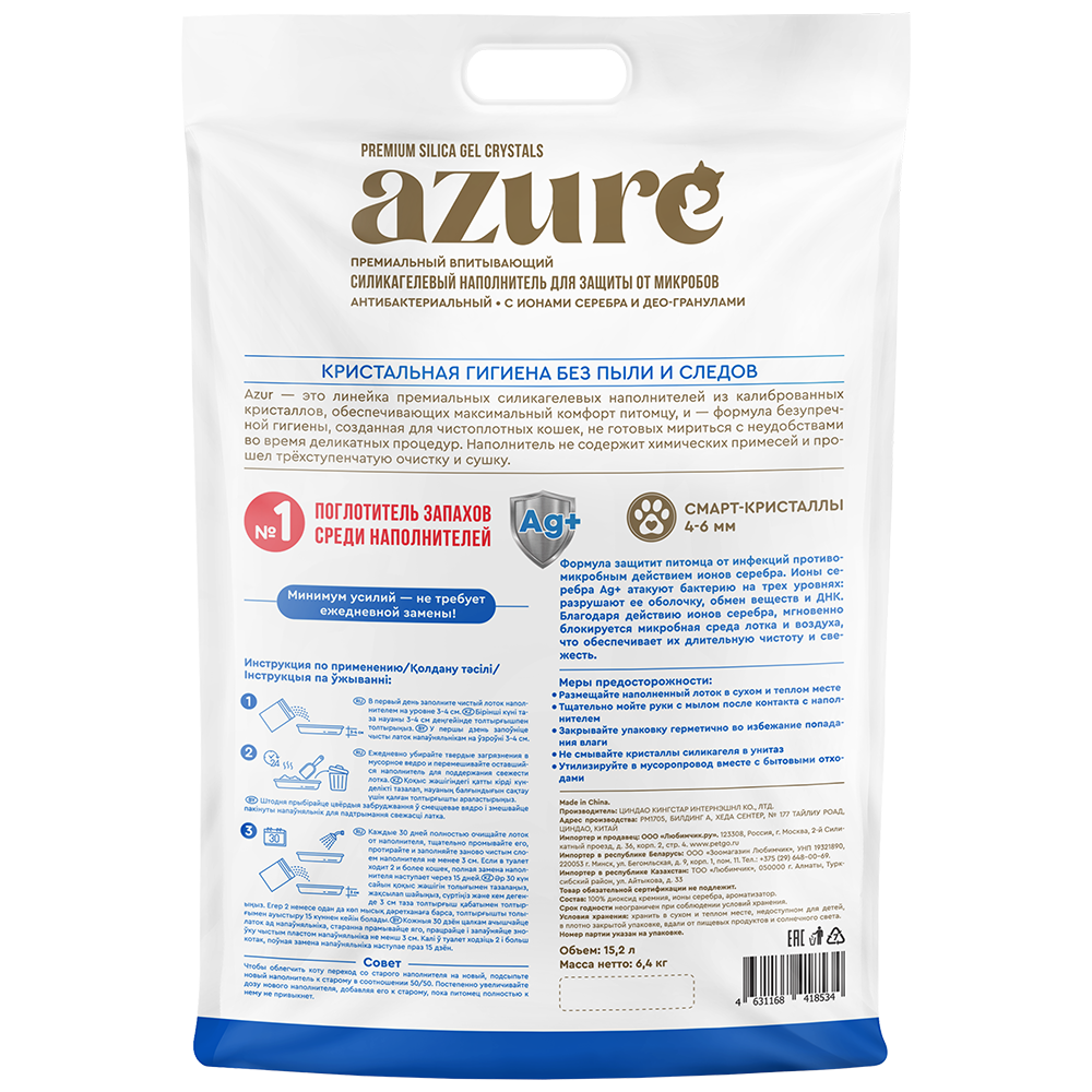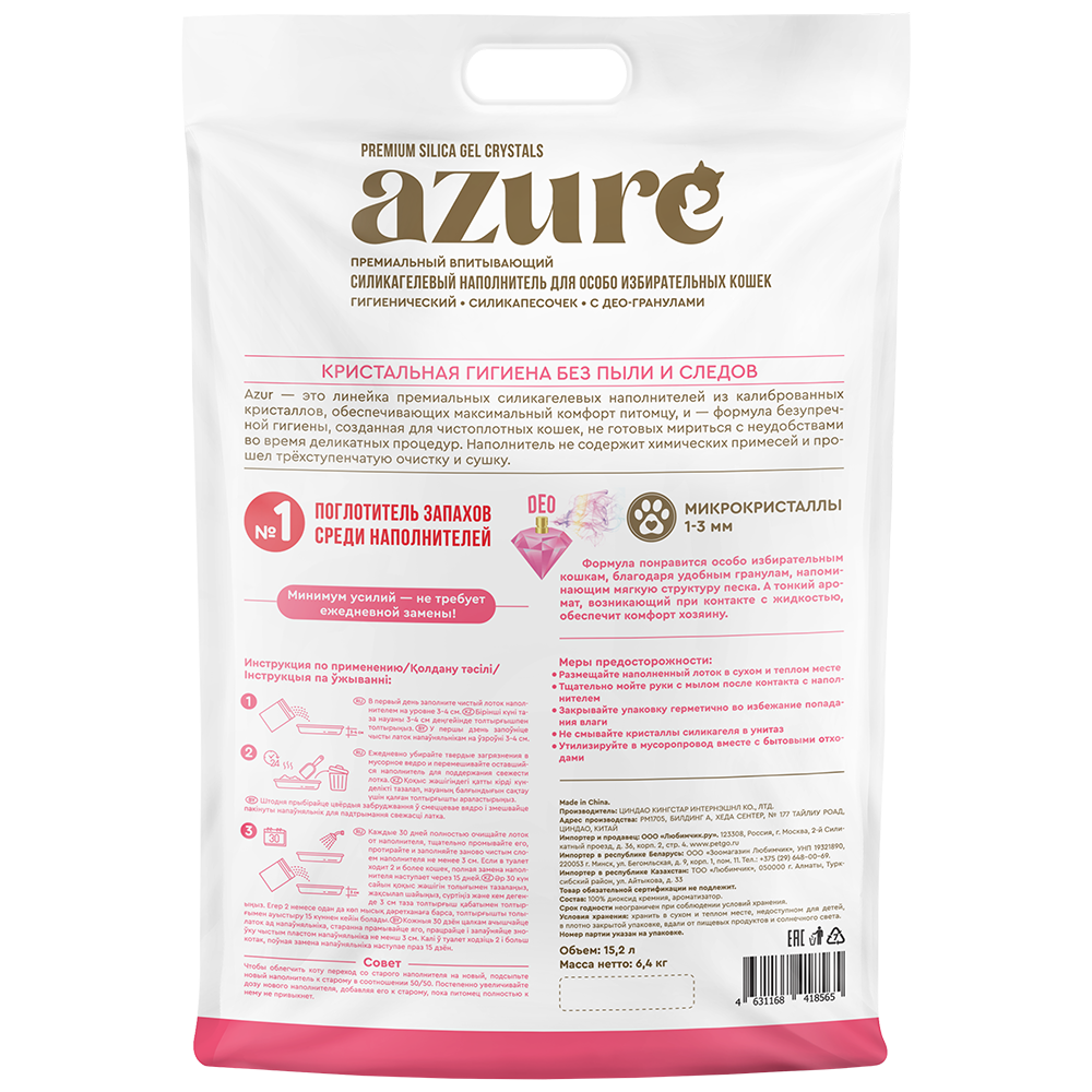 Гигиенический наполнитель Azure, смарт-кристаллы 4-6 мм, без запаха бережен к лапкам и удобен для туалета чувствительных котов, а так же не создает дискомфорта, благодаря отсутствию ароматов и красителей в составе.