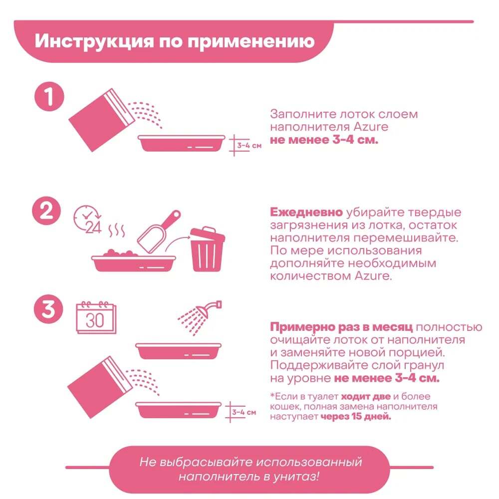Ежедневно убирайте твердые загрязнения и помутневшие гранулы в мусорное ведро, оставшийся наполнитель перемешивайте для поддержания свежести лотка, по мере расхода регулярно пополняйте свежей порцией.